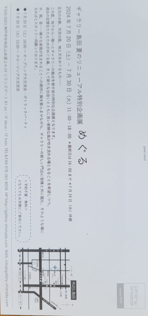 めぐる ギャラリー島田 夏のリニューアル特別企画展めぐる2024年7月20日(土)~7月30日(火)11:00~18:00最終日は16:00まで 24日は休館日 7月20日(土)16:00~ オープニング大交流会・ポトラックパーティー7月30日(火) 16:00~ クロージング大交流会 \ 最新情報をチェック / FacebookXBlueskyHatenaCopy 投稿ナビゲーション 摺ることから始まりギャラリー島田×Pou vol.2 「Jump into a Puddle with POU」 コメントを残す コメントをキャンセルメールアドレスが公開されることはありません。 ※ が付いている欄は必須項目ですコメント ※ 名前 ※ メール ※ サイト 次回のコメントで使用するためブラウザーに自分の名前、メールアドレス、サイトを保存する。 上に表示された文字を入力してください。 Δ